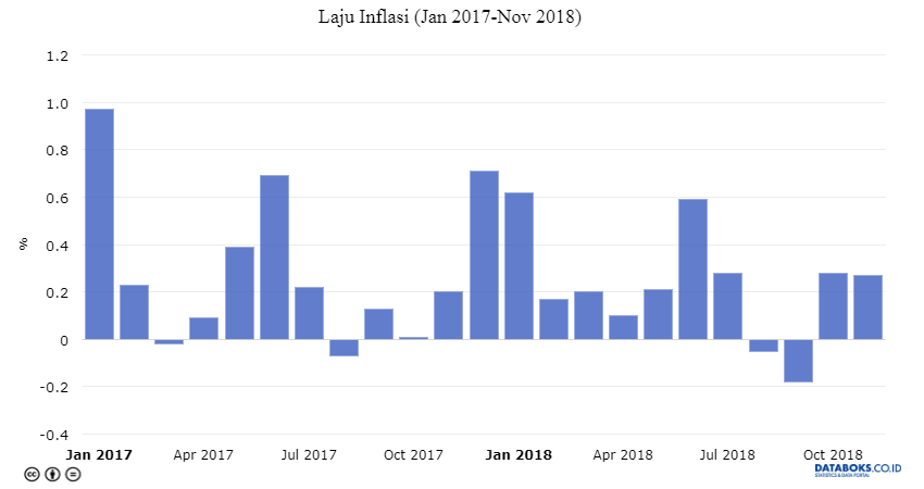 Seperti yang diketahui, berdasarkan data dari badan pusat statistik menunjukan bahwa inflasi november 2018 sebesar 0,27% jika dibandingkan dengan bulan sebelumnya yakni Oktober 2018 (MoM). Sementara itu, berdasarkan inflasi tahun kalender yang terjadi semenjak bulan Januari sampai dengan November 2019 telah terjadi inflasi sebesar 2,5% dan jia dilihat dari inflasi tahunan maka telah terjadi inflasi sebesar 3,23% dengan perbandingan bulan November 2017 terhadap November 2018.